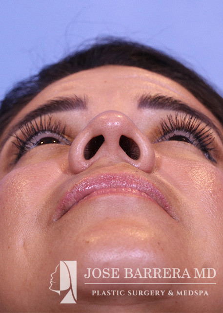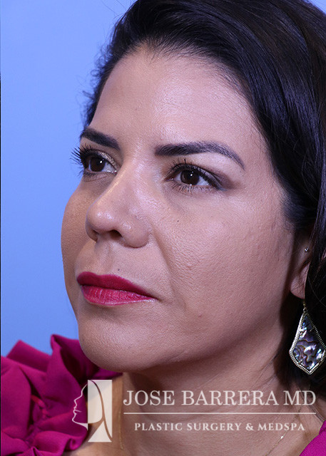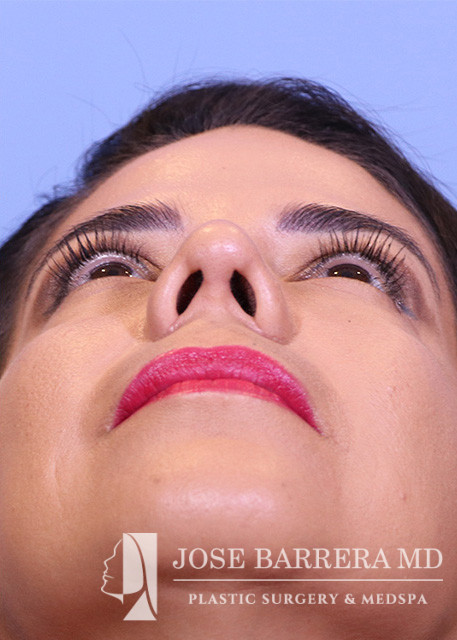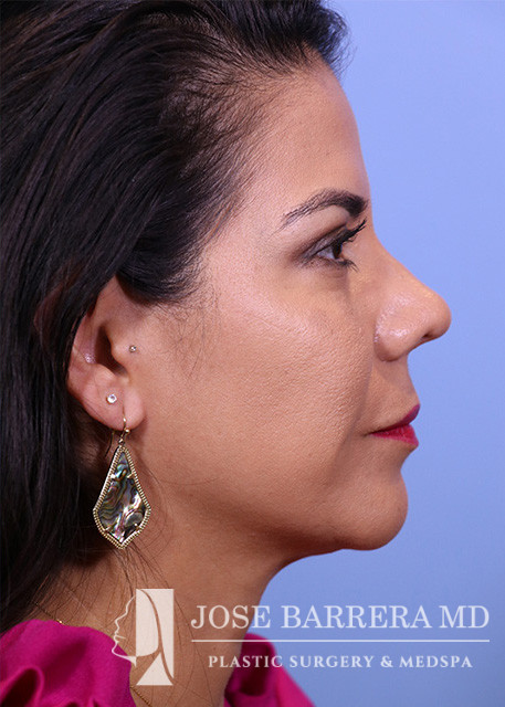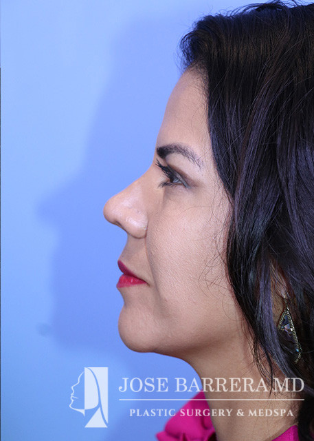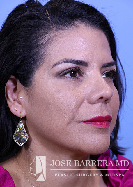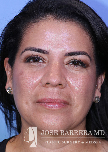 44-year-old female who is 1 year status post septorhinoplasty with cartilage grafting. The patient is healing well, breathing well, happy with early cosmetic result. She underwent a Primary cosmetic preservation septorhinoplasty with septal cartilage grafting (left SEG; supratip crushed cartilage graft), Supratip nasal SMAS flap, 4 mm Weir excisions. She had a Z flap dorsal preservation rhinoplasty with Dr. Barrera.