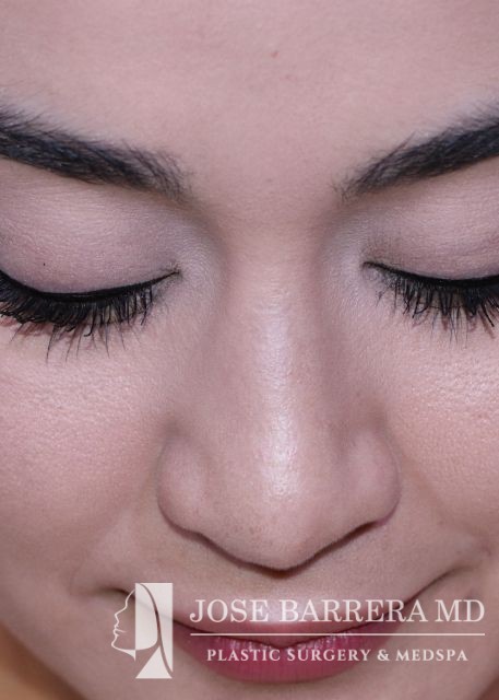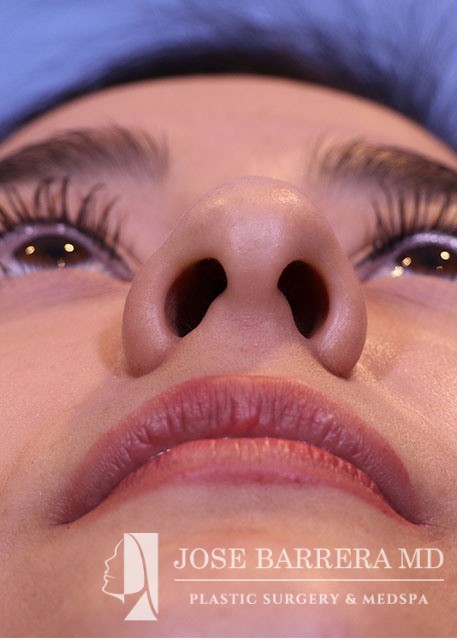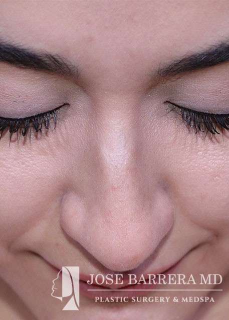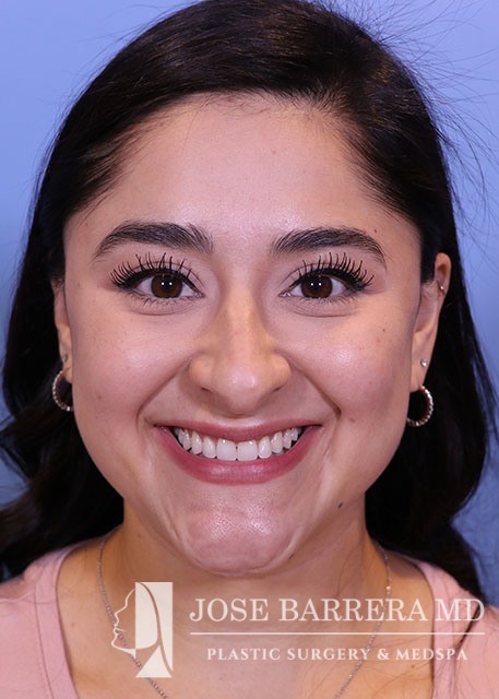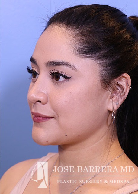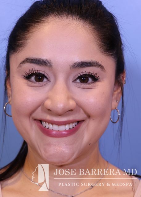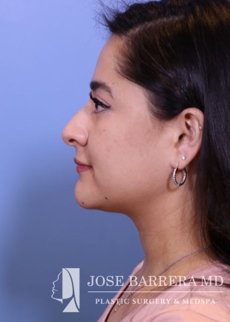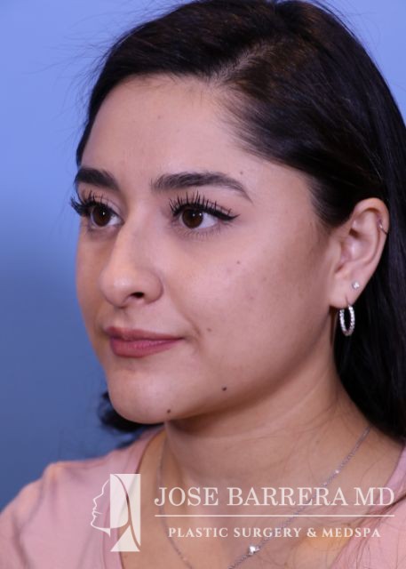 27-year-old presents with a dorsal hump and crooked nose. She underwent a preservation rhinoplasty with Dr. Barrera. She has a straight profile, improved nasal tip and symmetric nose after rhinoplasty.