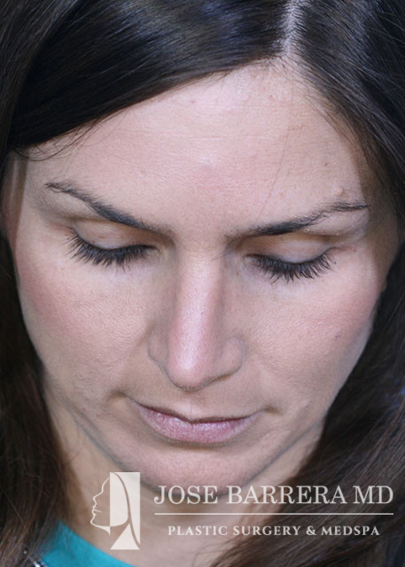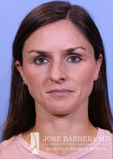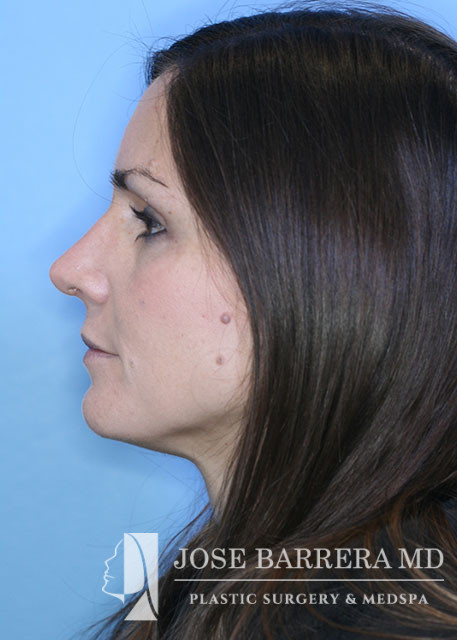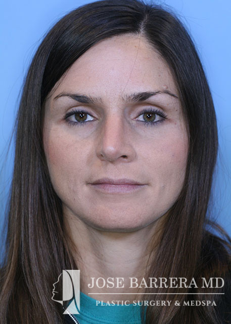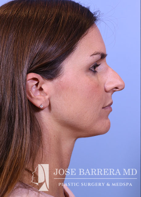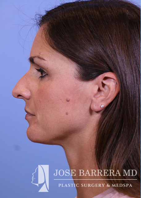 35-year-old female presenting today in consultation regarding aesthetic and functional nasal concerns. The patient desires dorsal hump reduction, tip refinement, and straightened nasal pyramid. She also complains of multiple episodes of sinusitis per year, along with nasal obstruction. She underwent Septoplasty, Turbinate Reduction, Nasal Valve Repair, Costal Cartilage Graft and Preservation rhinoplasty with left SEG, and Right external spreader graft.