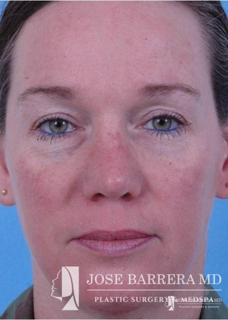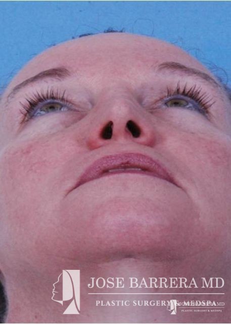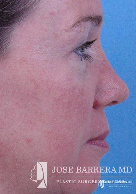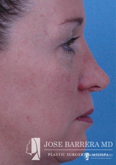 The patient is 3 months after revision rhinoplasty. The patient presented with a saddle nose deformity and a pinched nasal tip. She also had significant nasal obstruction from nasal valve insufficiency. Spreader grafts were placed followed by nasal tip refinement. Tongue in groove sutures were placed. Bone anchor suture technique was used for lateral wall suspension to improve the nasal valve. An improved nostril opening and nasal valve correction was achieved.