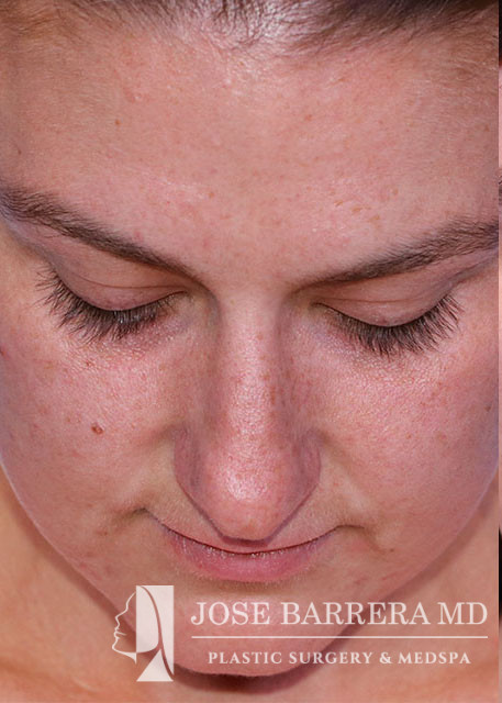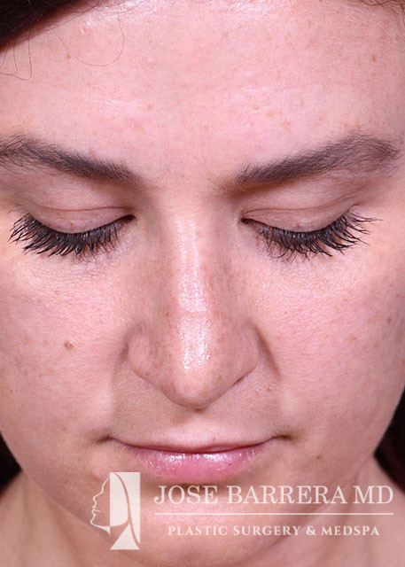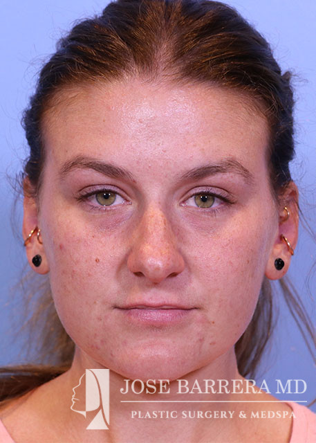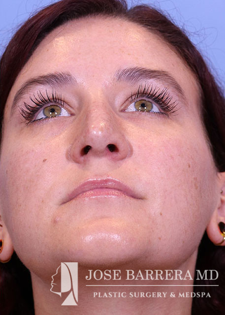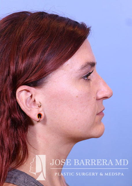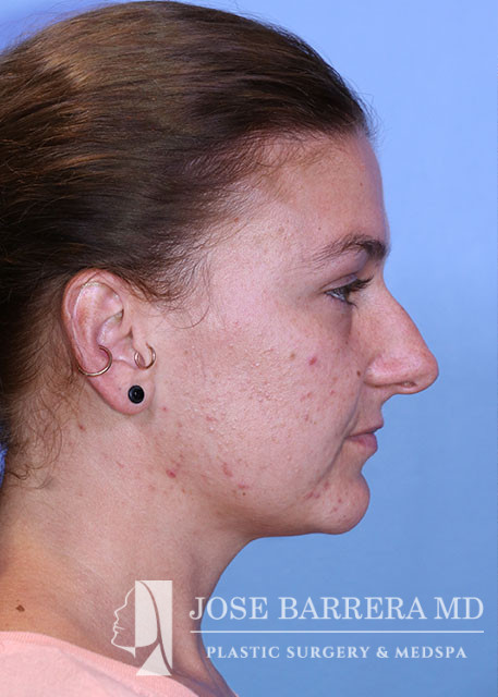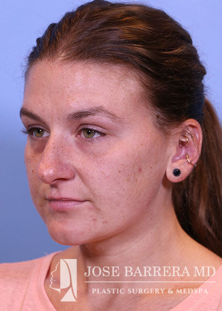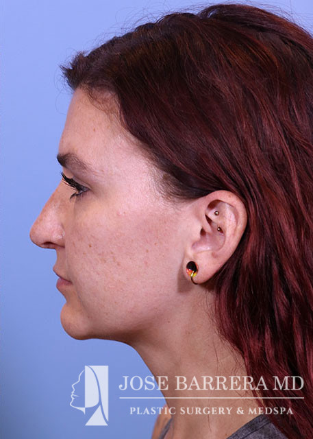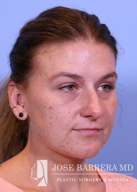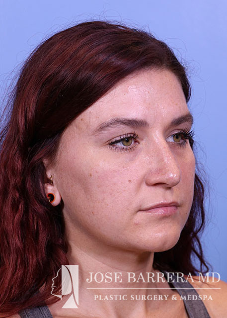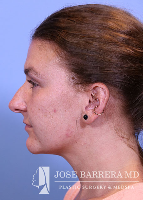 29-year-old female presenting today in consultation regarding aesthetic nasal concerns. Patient desires dorsal hump reduction, tip refinement, narrowed nasal dorsum, decreased projection and desires an overall smaller nose. Revision cosmetic preservation rhinoplasty with costal grafting was performed. There was removal of previous scar tissue and a septal extension graft (SEG) was placed. Ultrasonic rhinoplasty was performed for low low high osteotomies, dorsal sculpting with piezoelectric system, placement of left SEG, right extended spreader, tongue in groove, and alar cinching sutures. She is one year postop from her original rhinoplasty.