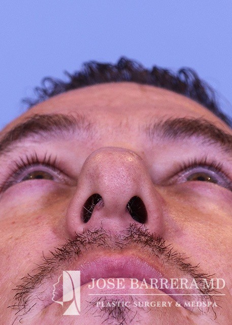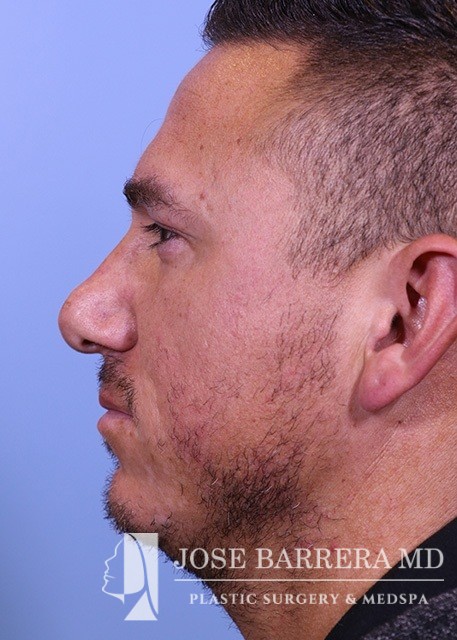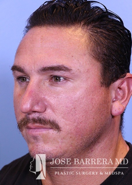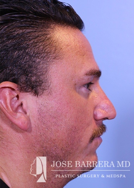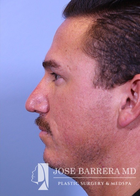 37-year-old male with nasal obstruction, bulbous nose, and convex nasal cartilages. He underwent septorhinoplasty with Dr. Jose Barrera. Nasal tip refinement with cephalic reduction and lateral crural strut grafts were placed to reshape the nasal tip. A septal extension graft was used to lengthen the nose.