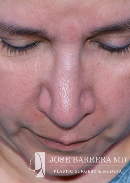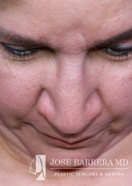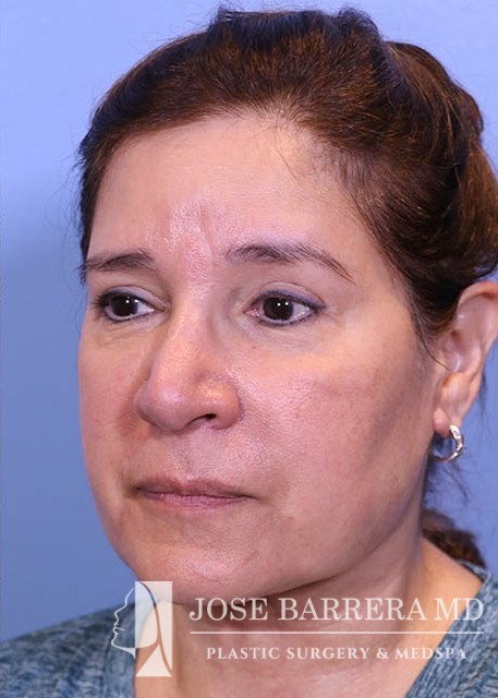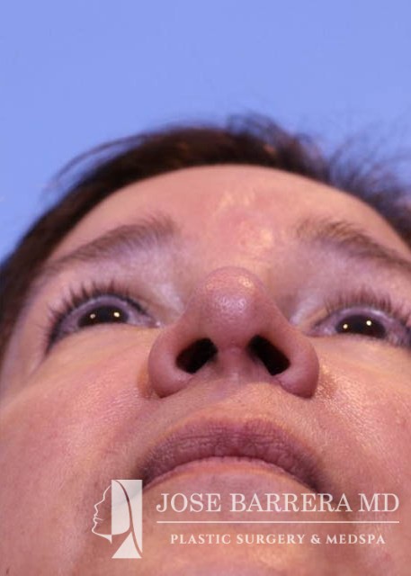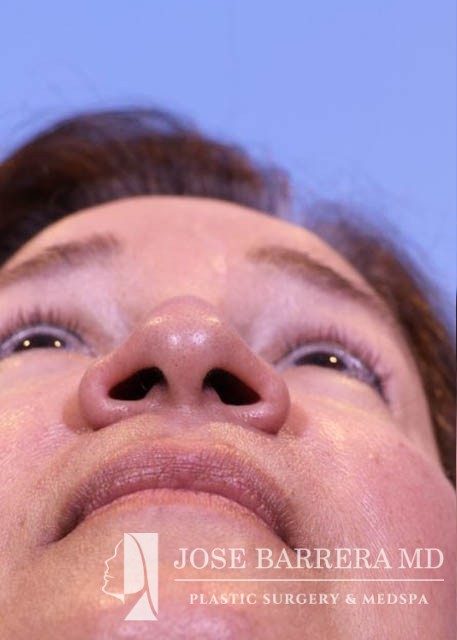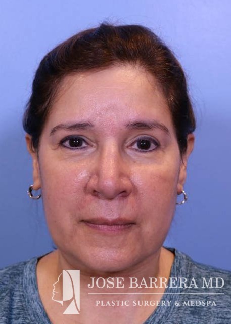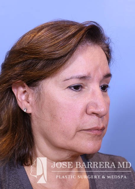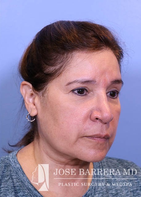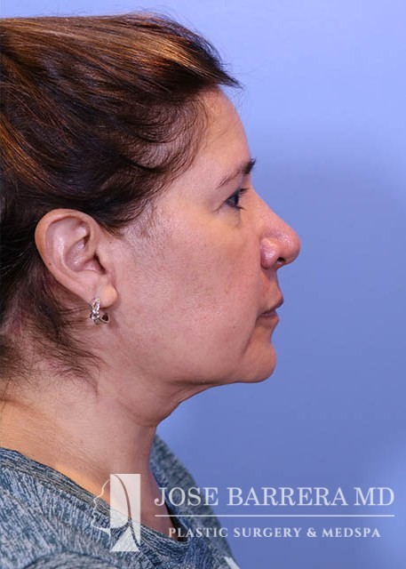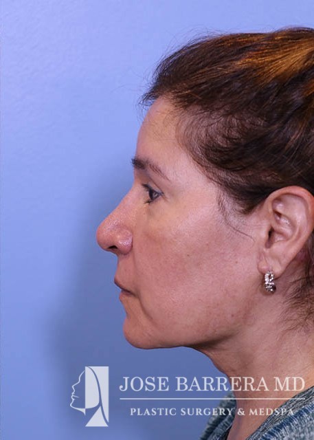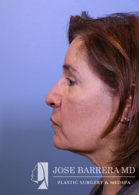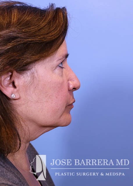 63 yo female who presented with nasal tip droop (ptosis), a wide nasal base and dorsal hump. She also had neck banding and creepy neck skin. She had previous rhinoplasty surgery. She underwent a revision rhinoplasty with costal cartilage grafting with Dr. Barrera as well as a MIDE (minimally invasive deep elevation) Mini-Facelift and Neck Lift. The MIDE operation is a deep plane elevation of the SMAS with a minimal behind the ear hidden scar. The patient has done well as is 3 months postop.