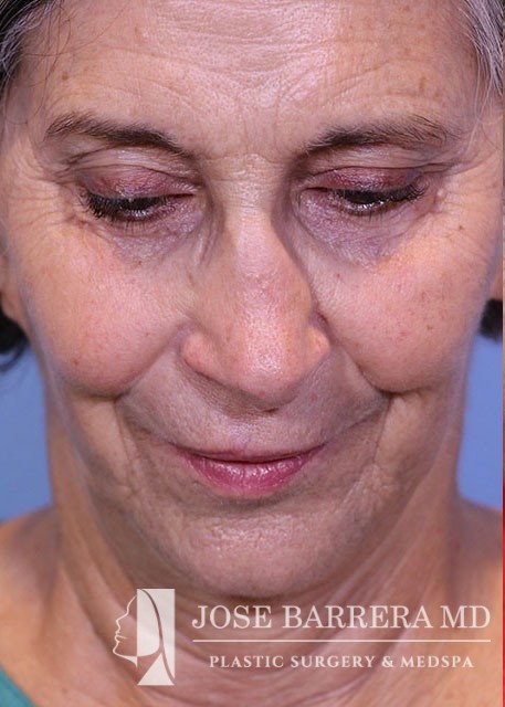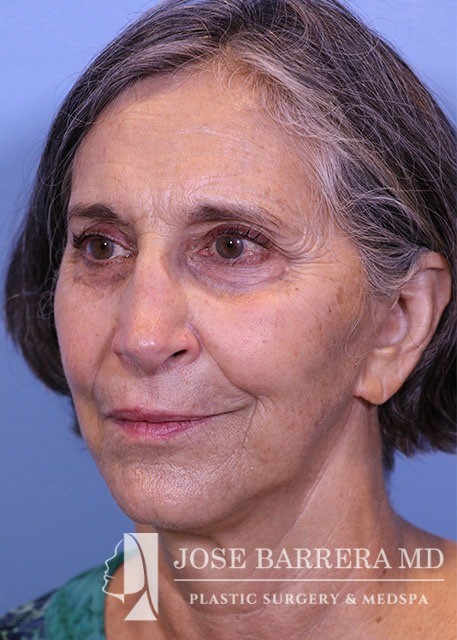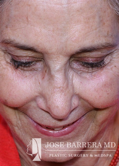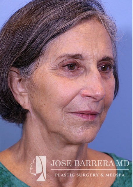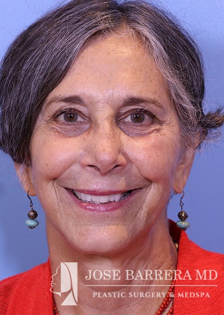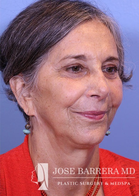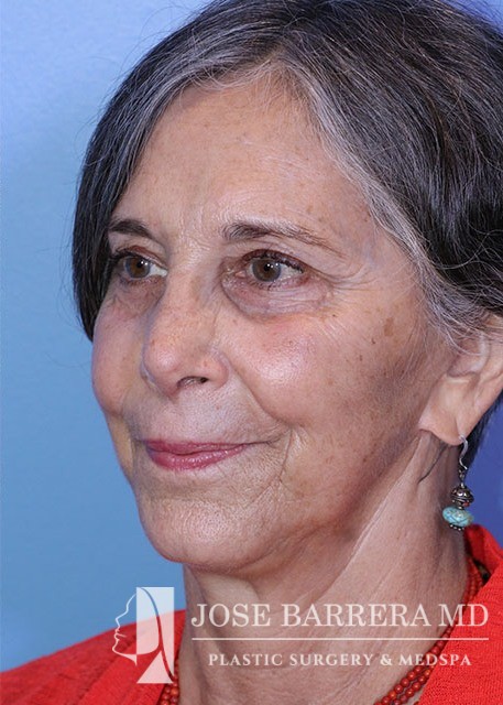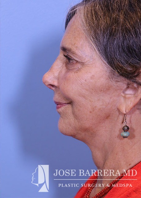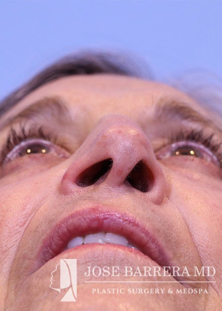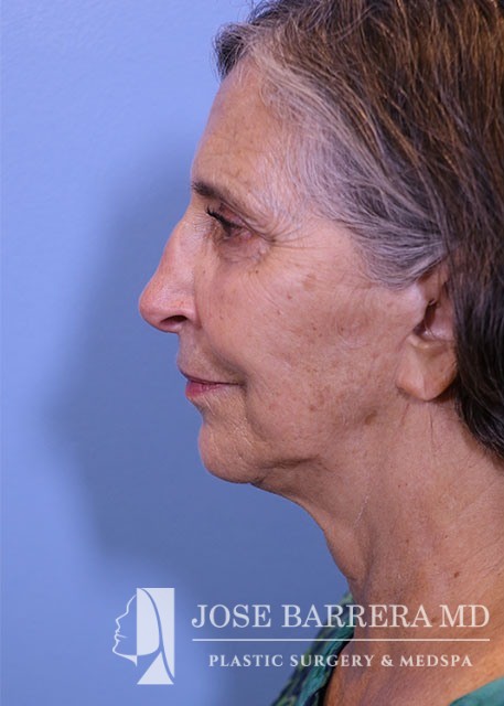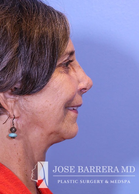68 yo female who presented with traumatic nasal deformity and severe deviated septal fracture and nose. She had previous rhinoplasty surgery. She underwent a revision rhinoplasty with costal cartilage grafting with Dr. Barrera. She is 3 months postop from her revision rhinoplasty. She is also 6 years postop from her deep plane facelift and shows good improvement in her neck bands and skin laxity.