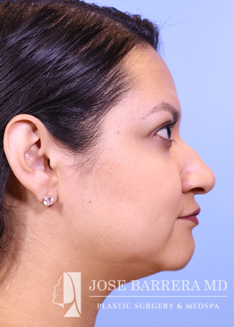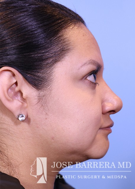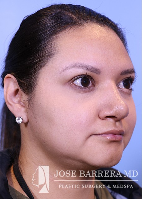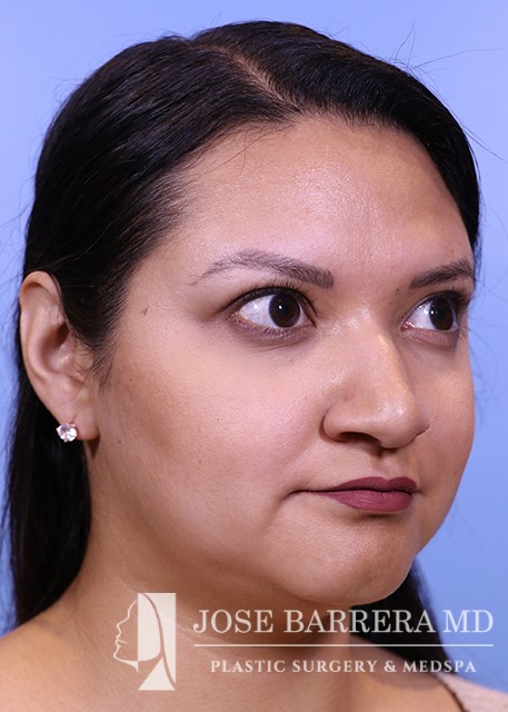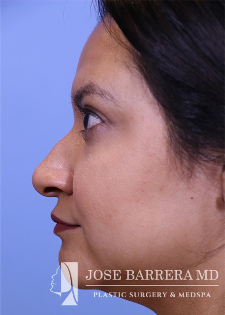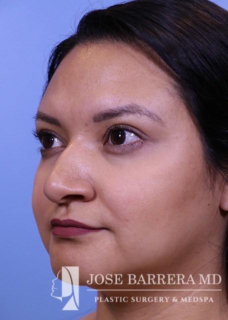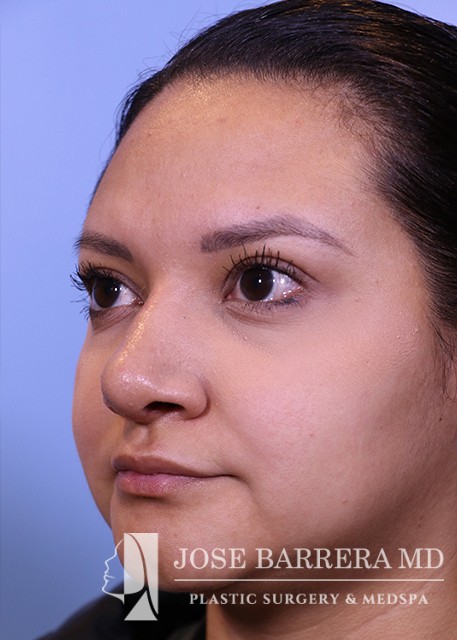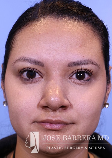 28-year-old female for rhinoplasty. She is concerned about a nasal hump and widening of her nasal tip. She has a deviated septum and some obstruction from her nose. She would like to have this repaired. She has done extensive research into rhinoplasty and wants improvement in dorsum and elevation of her nasal tip. Bilateral spreader grafts were placed between the upper lateral cartilages and septum. A thicker spreader graft was placed on the left side to compensate for the depressed midvault. This with the upper lateral cartilages were resecured to the septum with multiple 5-0 prolene and 4-0 PDS mattress sutures. An incision was made along the pyriform aperture and the skin and soft tissue was elevated off the maxilla and nasal bones. Lateral incomplete osteotomies were then performed to narrow the upper vault. The domes of the lower lateral cartilages were divided and the caudal septum exposed. A caudal extension graft was placed to rotate up the tip and provide support. This was secured to the nasal spine and caudal septum with 4-0 PDS. We then moved to tip refinements. Cephalic trims of the lower lateral cartilages were done leaving 8 mm lateral crural struts. Dome spanning sutures were placed to create tip defining points, and lateral crural steal techniques used to create more rotation. Lateral crural tension was then placed to approximate and secure the domes and flatten the lateral crura. Columellar strut was placed to provide even more rotation.