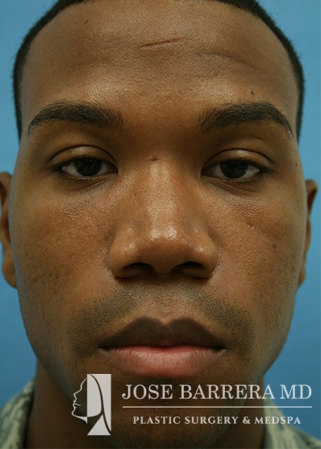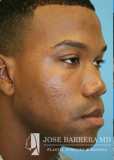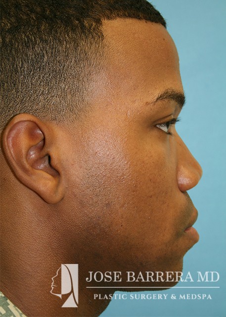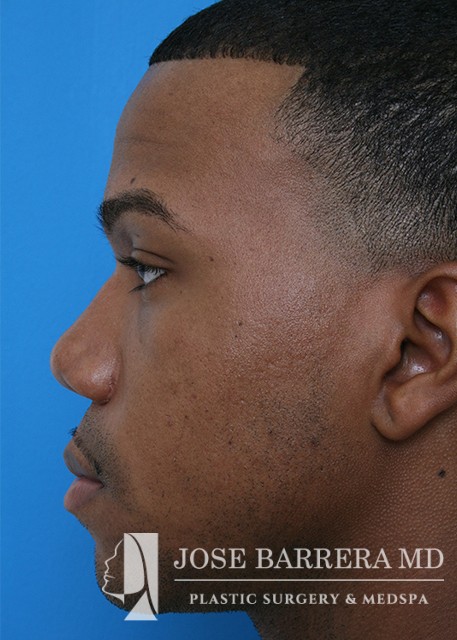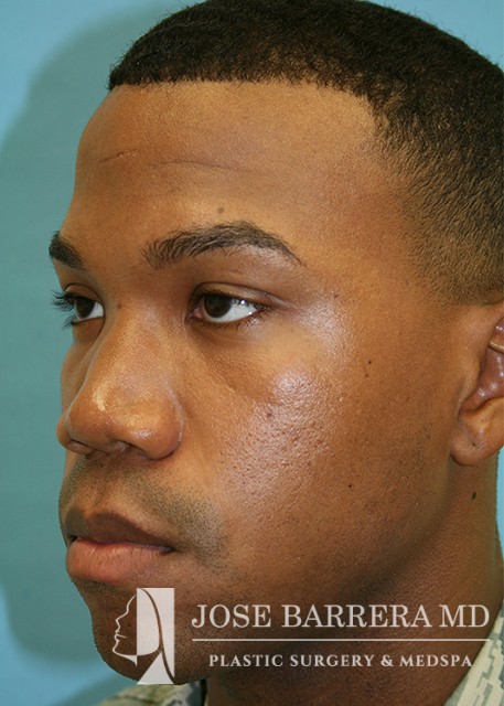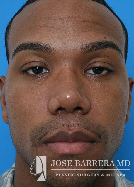 African American patient presented for ethnic rhinoplasty. He wanted a more aesthetically pleasing nose with an emphasis on boney narrowing of the dorsum, nasal tip and alar base of the nose. Low low high osteotomies were made to narrow the boney pyramid. Nasal tip refinement was performed as well as Weir excisions. The patient is 6 months postoperative with Dr. Barrera
