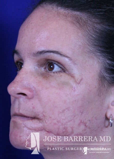 This 37 year old police officer was on-duty was she was struck at a high rate of speed on her driver-side. She underwent a three-stage reconstruction. First stage was Lefort I open reduction internal fixation, ORIF mandible, and orbital fracture repair. Stage 2 was a left eyelid and canthal tendon repair. Stage 3 was Erbium: Yag Laser resurfacing and cheek scar revision.