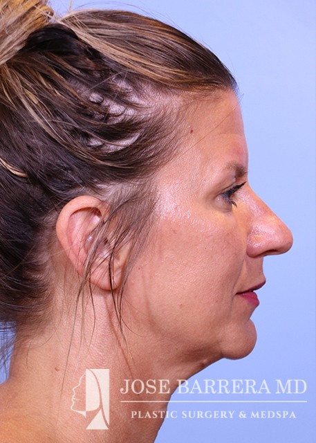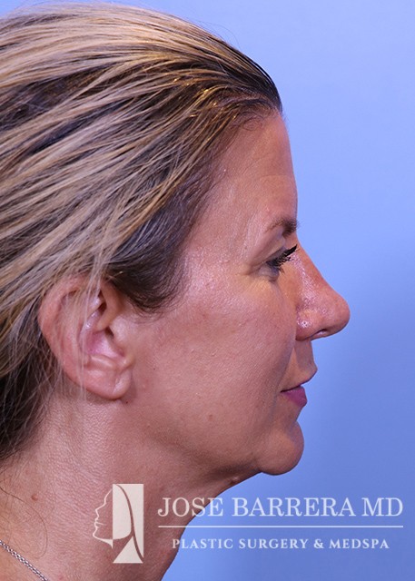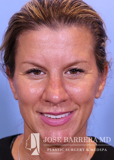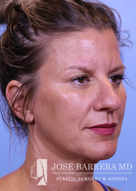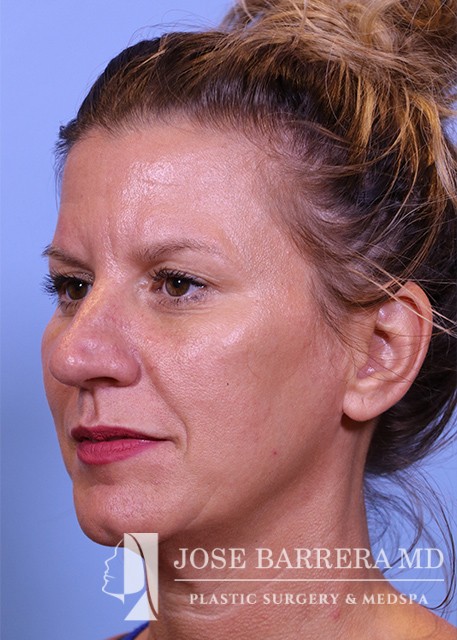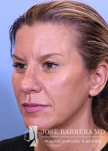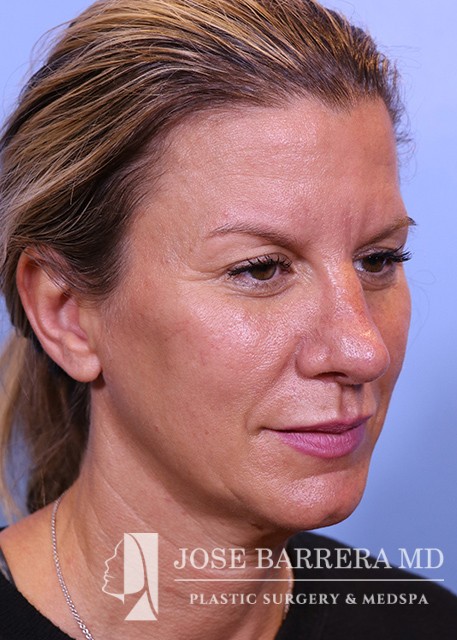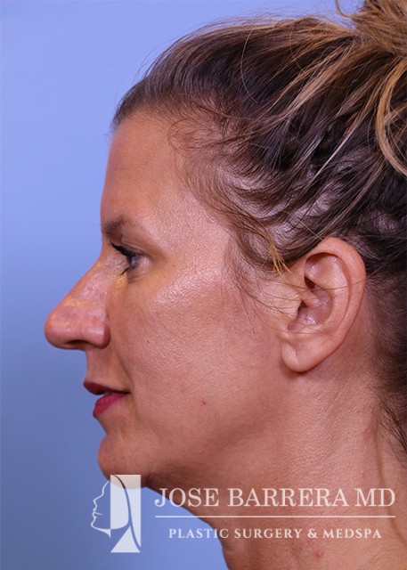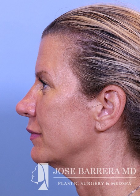 43-year-old female with a crooked nose and left middle vault collapse. The patient had a boxy nasal tip as well. A septorhinoplasty was performed to improve the asymmetry. Spreader grafts were placed as well as nasal tip refinement. The dorsum was lowered to improve the slope of the nose. The nasal tip was projected with a septal extension graft. She is 12 months postop.