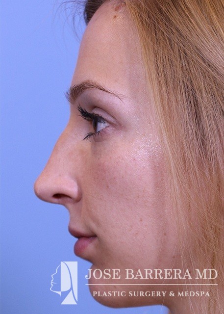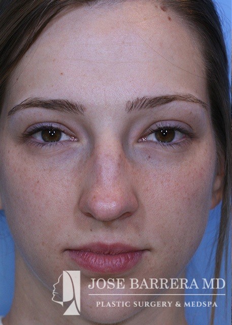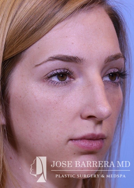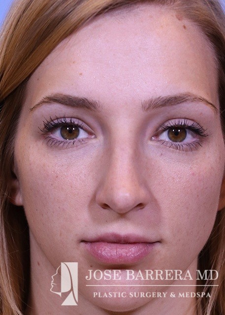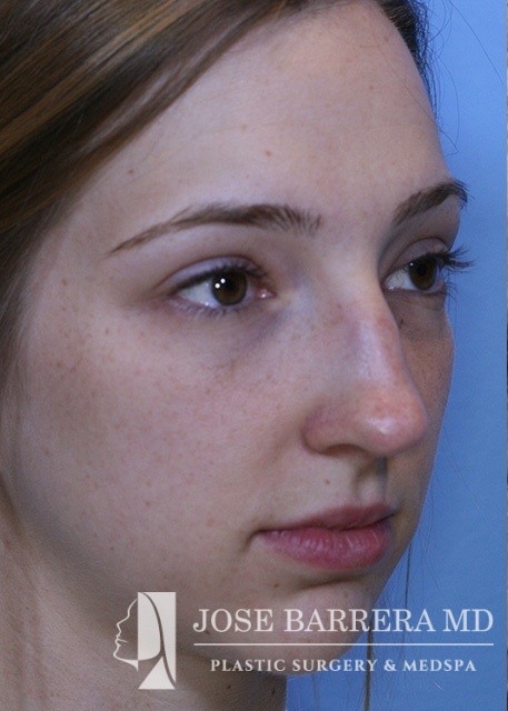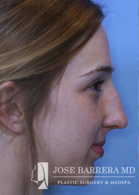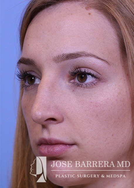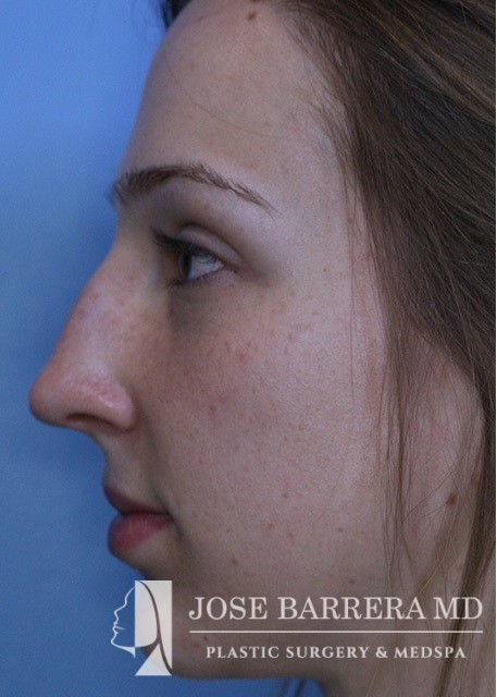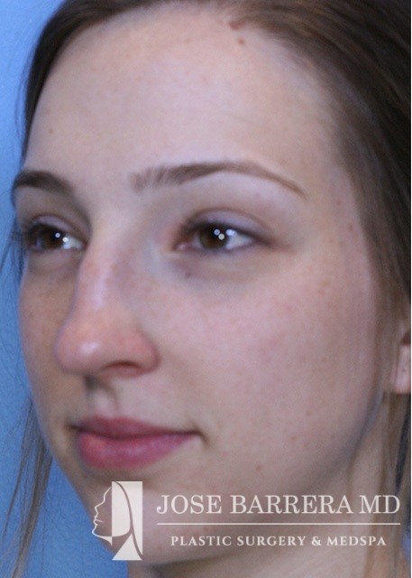24-year-old female who is one year postop from her septorhinoplasty. She had a prominent nasal hump, rhinion spurs, and wide tip. She underwent structural rhinoplasty with Dr. Barrera. She received a hump reduction, spreader grafts, and nasal tip refinement and rotation.