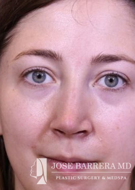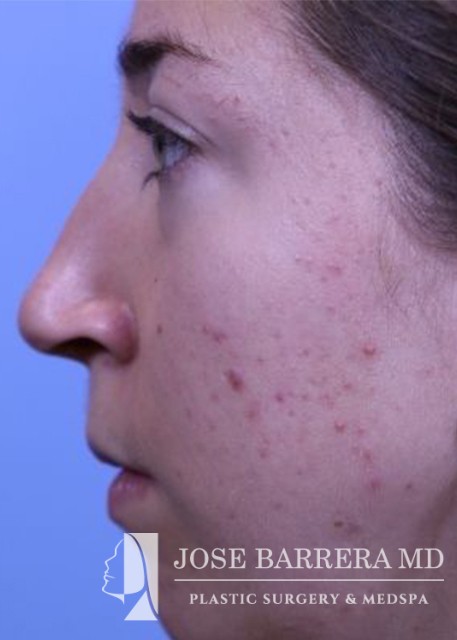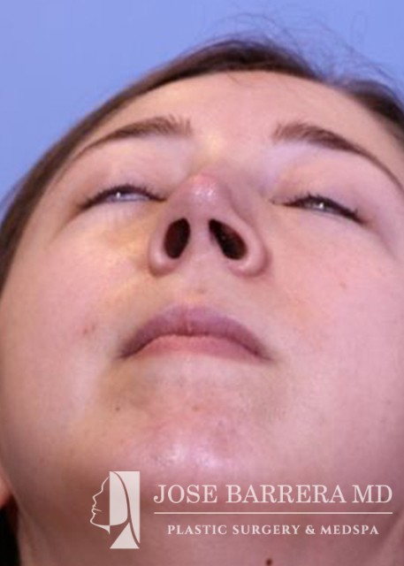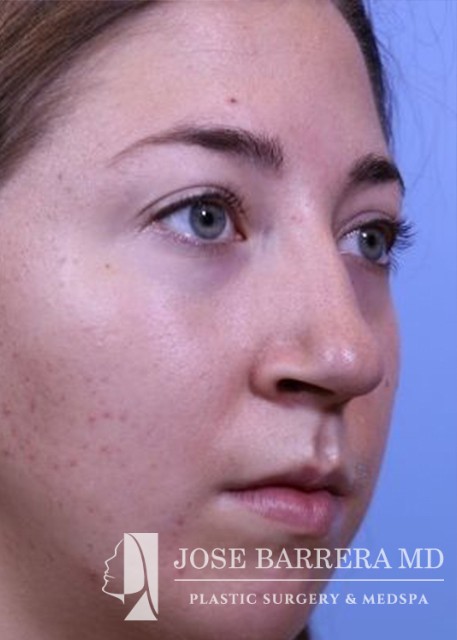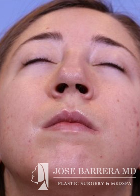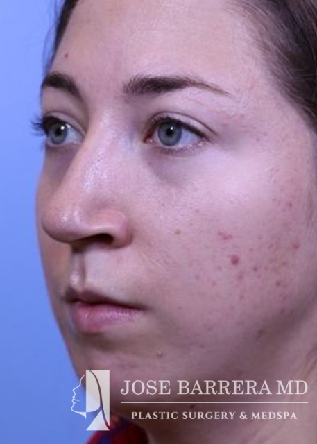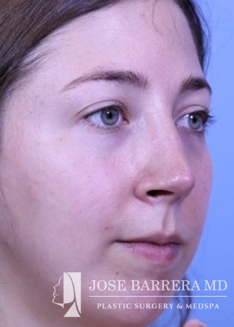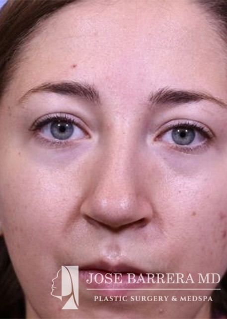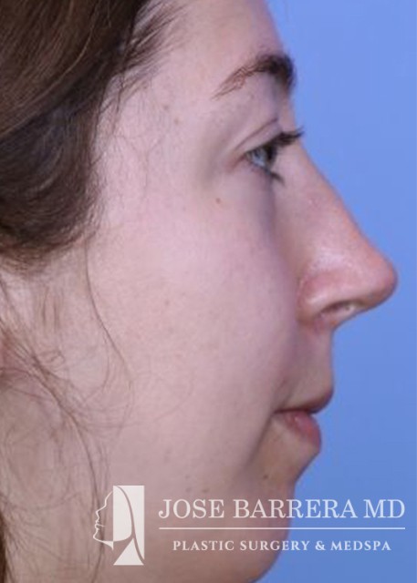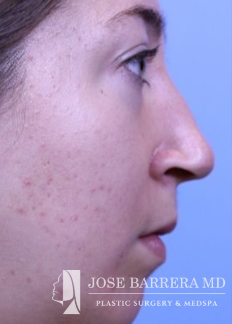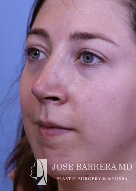 26-year-old female presents for nasal tip refinement, improvement in symmetry and dorsal hump removal. She underwent Septorhinoplasty with Dr. Barrera. In the procedure, the medial crura were separated sharply. Cephalic trims were performed leaving 8mm wide lower lateral cartilages. A septal extension graft, left spreader graft, and bilateral lateral crural strut grafts were previously placed. 5-0 prolene transdomal and lateral crural tensioning sutures were placed to create new domes and increase rotation, securing the lower lateral cartilages to the septal extension graft. The skin was elevated off the medial crura. A tongue-and-groove procedure was performed.