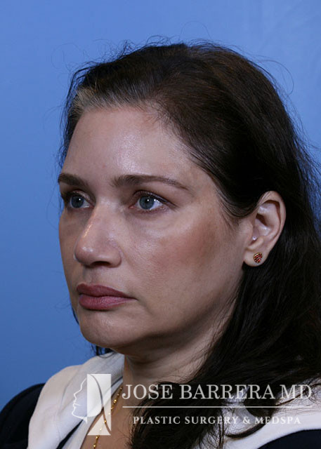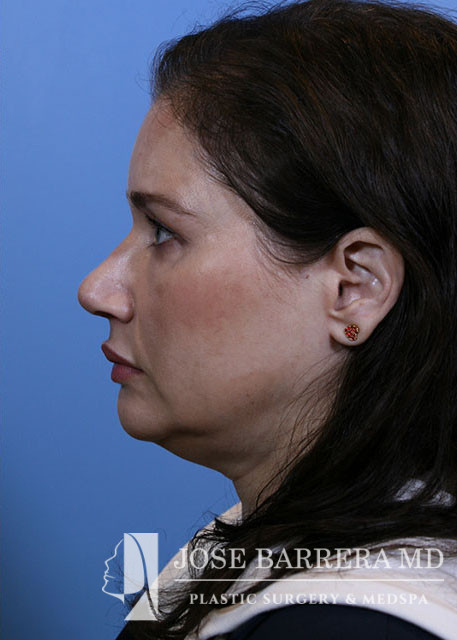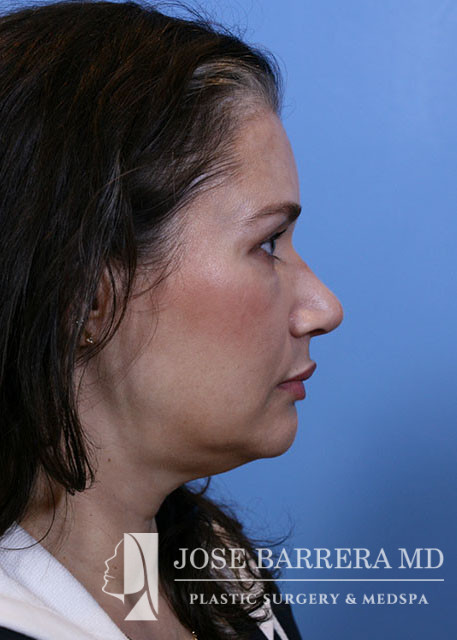 Procedure:An inverted V columellar incision and marginal incisions were marked out and incised. The soft tissue envelope was lifted off the cartilage and bony framework. The periosteum over the nasal bones was incised and elevated.An incision was then made along the pyriform aperture and the skin and soft tissue were elevated off the maxilla and nasal bones to prepare for osteotomies. The Piezo saw high-low-high lateral osteotomies. The dorsal roof was reduced with a diamond tip Piezotome and 15 blade. The dorsal roof remained intact. A 4-0 PDS suture was then used to reapproximate the nasal dorsum and upper lateral cartilages. Ballerina maneuver was performed to help release the lateral portions of the lower lateral cartilages for reposistioning.The medial crura were separated sharply. The anterior septal angle was identified. A left mucoperichondrial flap was elevated. Dissection proceeded anteriorly around the caudal end of the septum allowing elevation of a mucoperichondrial flap on the right.Inferior septal cartilage was harvested in one piece with care taken to maintain greater than 1.5 cm L strut. The anterior left upper lateral cartilage was released from the septum. Cephalic trims were performed leaving 8mm wide lower lateral cartilages and releasing the scroll. A septal extension graft was fashioned from the harvested septal cartilage and secured to the maxillary crest and left side of the native septum with 4-0 PDS and 5-0 prolene. 5-0 prolene dome spanning and lateral crural tensioning sutures were placed to create new domes and increase rotation, securing the lower lateral cartilages to the septal extension graft. The skin was elevated off the medial crura. A tongue-and-groove procedure was performed and the medial crura were sutured to the caudal septum with 5-0 prolene. Medial crural fixation sutures were placed to secure the medial crura together and narrow the columella. Footplate binding suture was performed with 5-0 chromic suture.