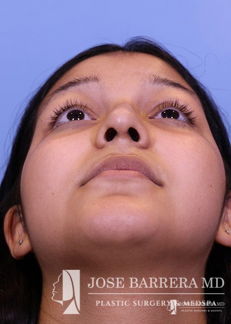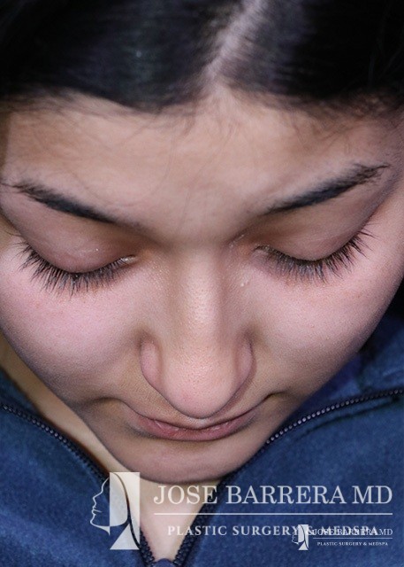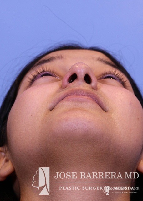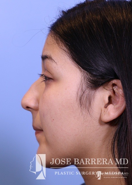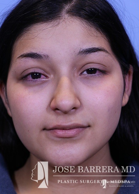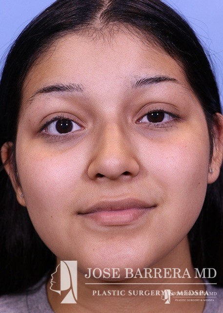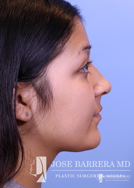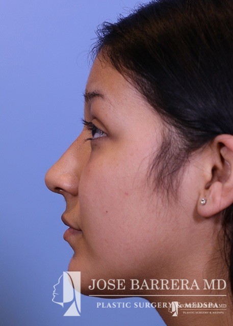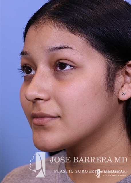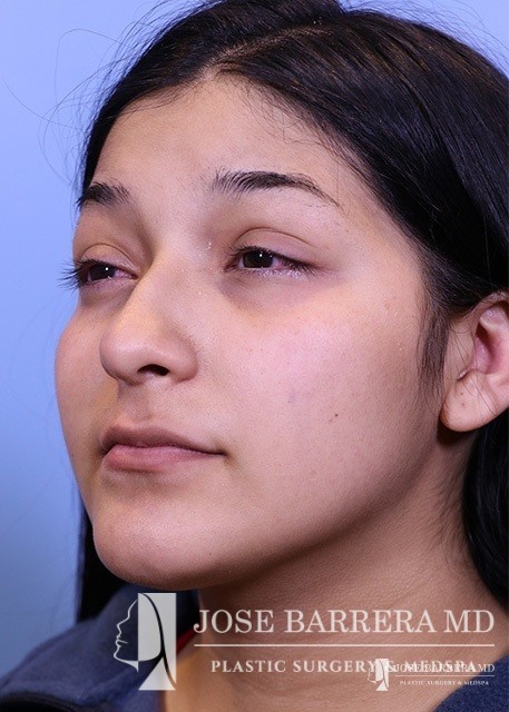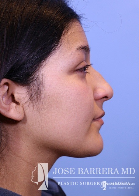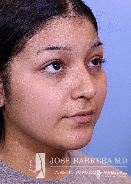 Teenage patient who underwent septorhinoplasty. A hump reduction was performed. Septal cartilage grafts were formed using spreader grafts. The middle vault was narrowed. Nasal tip rotation and tip refinement was performed.