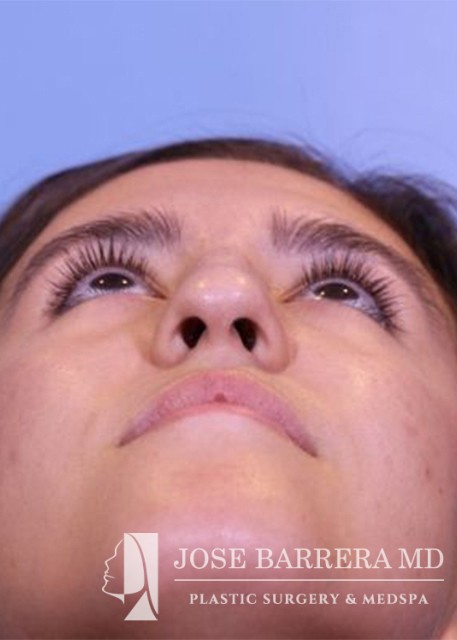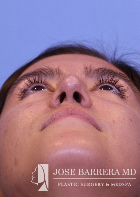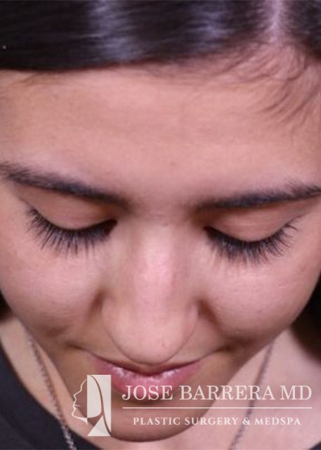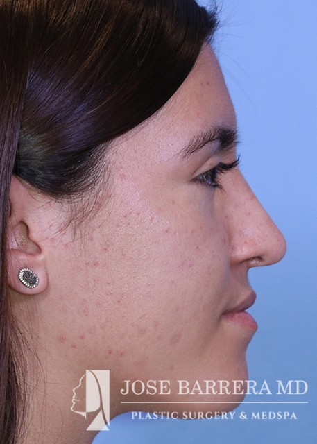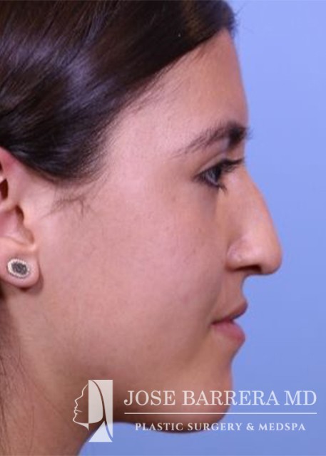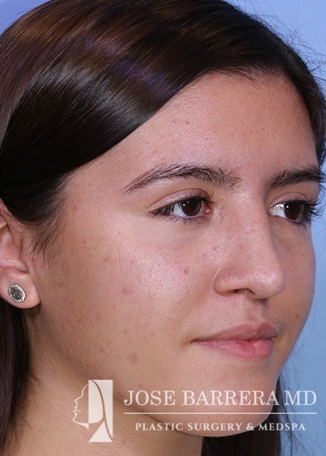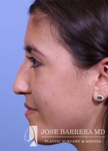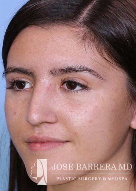 18-year-old female who underwent a primary rhinoplasty to improve nasal hump, nasal tip droop, and a bulbous tip. She had a dorsal hump reduction using ultrasonic rhinoplasty techniques and Dr. Barrera improved tip projection with a septal extension graft. She is one year postoperative from her surgery.