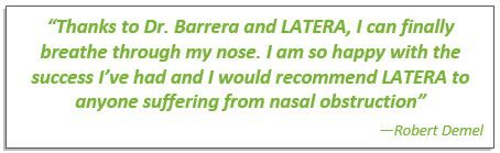 Dr. Barrera explained that the cause of my nasal obstruction was due to nasal valve collapse (NVC), which occurs when the lateral (side) wall collapses when you inhale. He told me about LATERA absorbable nasal implants, which have been placed in thousands of patients who had difficulty breathing through their nose due to NVC. He told me that the LATERA implant would be inserted through a small incision in my nose with little risk of changes to appearance – this was really appealing.